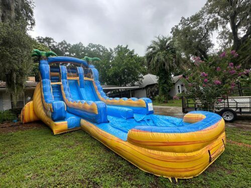 When the temperature climbs in Sanford, Deltona, Orange City, or a surrounding area, a waterslide turns your backyard into the coolest spot in the neighborhood. Kids race up the ladder, slide down the slick surface, and splash into the pool at the bottom while parents adjust the hose to keep water flowing evenly. The unit stays inflated throughout the event, and the constant motion keeps everyone engaged without needing additional entertainment.